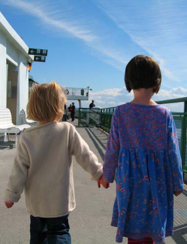 Clara and Lyla walk along the deck of the ferry to Bainbridge Island.