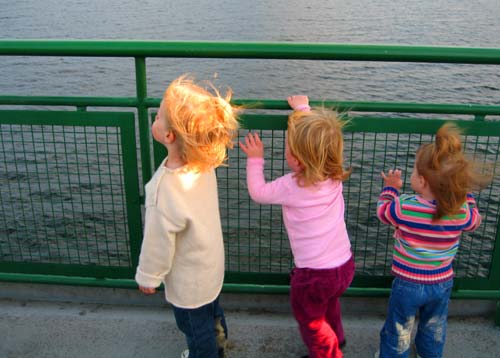 Clara, Bella, and Lilly ignore the chill wind to watch boats go by the ferry. (No, Clara didn't dye her hair, but the sun lit it up like it was on fire.) < previous | next >