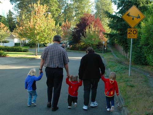 Nana and Papa have their hands full (literally) on the way to the park near their house. < previous | next >