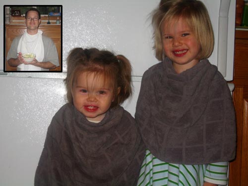Lilly and Clara show off their "salad bibs" (kitchen towels) that are now mandatory salad-eating equipment after I ruined one too many shirts by dripping oil-and-vinegar dressing down the front. (Yes, everyone gets to wear salad bibs.)