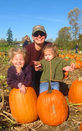 Amy, Clara, and Lilly look into the sun for a photo with their pumpkins at our annual pumpkin picking expedition at Fall City Farms. This year was all about tall pumpkins with silly stems.