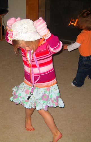 Clara is dressed to the nines and flashing some fancy moves in a pre-lunch dance party. The music? New Order's Get Ready. (That's my new wave girl!) < previous | next >