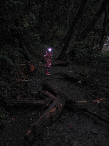 Clara stands in the midst of logs and other flood debris left by the receding waters of the South Fork. < previous | next >