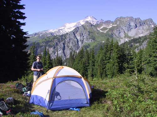 Nick sets up the first night's camp on the edge of a hill with a killer view of Glacier Peak.