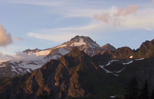 Glacier Peak glows a dusky red in the light of the setting sun after our first day's efforts.