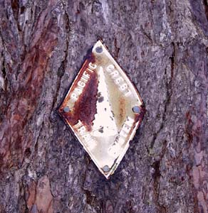 Nailed to trees at varying intervals, badges like this identify the Pacific Crest Trail system.