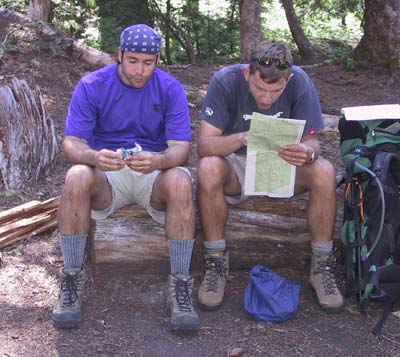 Dan works on a "bar" while Nick studies the map at Wenatchee Pass.