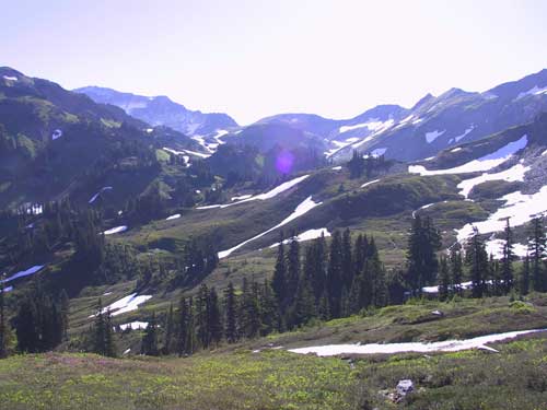 The Whitechuck River, our erstwhile companion for the last 17 miles, disappeared into these rolling hills and under the base of the Whitechuck glacier.